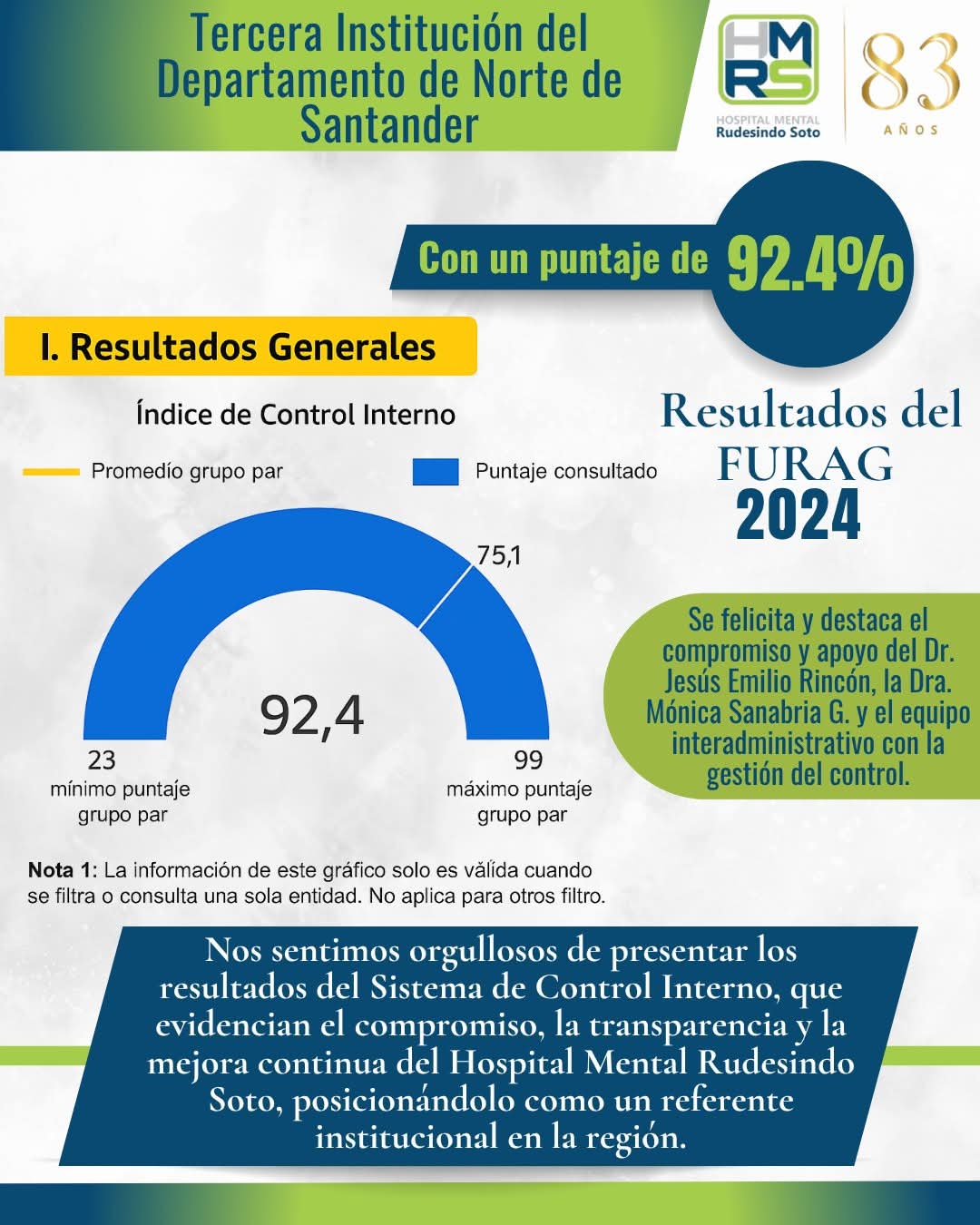 🎉 ¡Orgullo institucional! 🏥 Con un destacado 92.4% en el Índice de Control Interno 📊, la E.S.E. Hospital Mental Rudesindo Soto se consolida como referente en la región. Resultado FURAG
