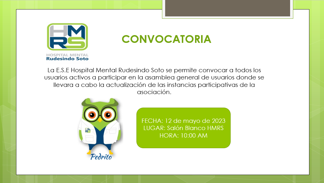 La E.S.E Hospital Mental Rudesindo Soto se permite convocar a todos los usuarios activos a participar en la asamblea general de usuarios donde se llevara a cabo la actualización de las instancias participativas de la asociación. Convocatoria Asamblea General Usuarios